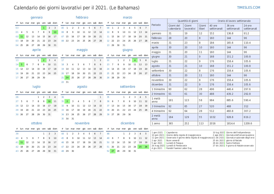 Scarica e stampa il calendario dei giorni lavorativi in PDF con giorni festivi e fine settimana per il 1 trimestre 2021 per le Bahamas