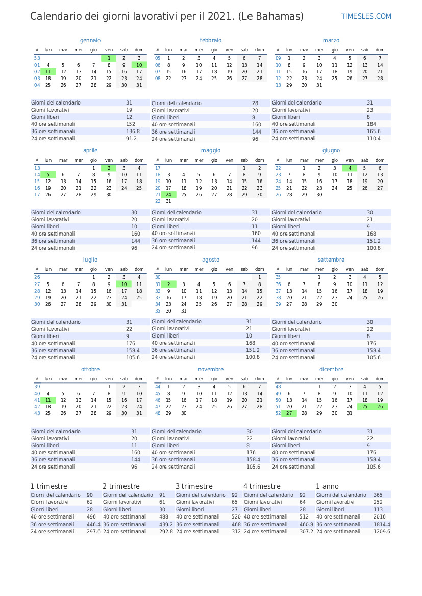 Per il 1 trimestre del 2021, ci sono 6 giorni di ferie e di riposo alle Bahamas. Il 1 trimestre 2021 inizia il di venerdì e termina il di mercoledì.
