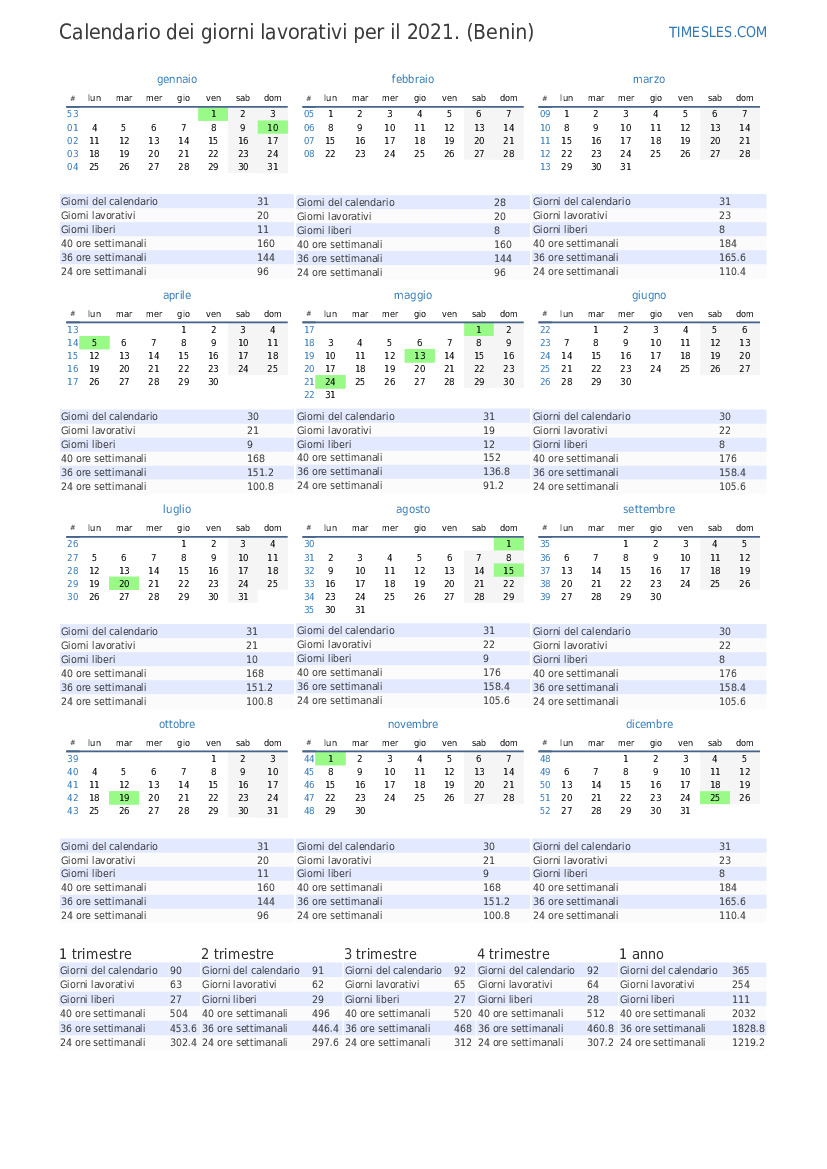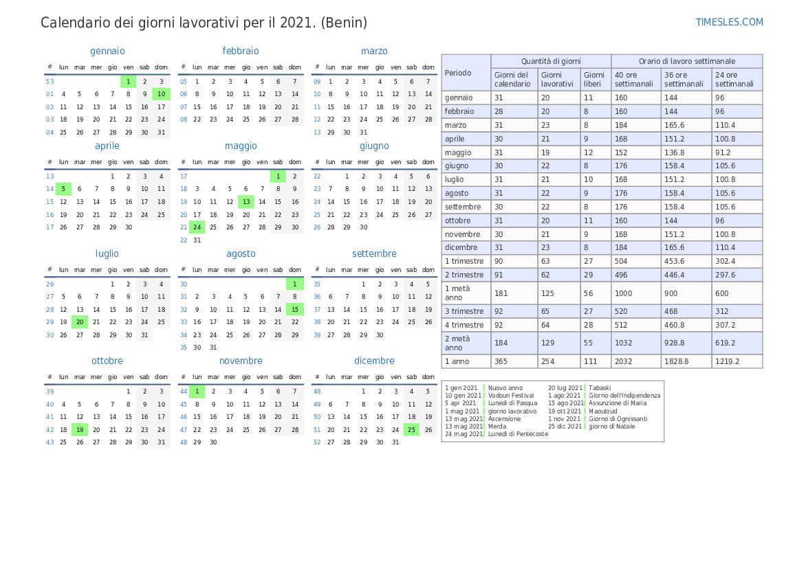 Per il 2 trimestre del 2021, ci sono 8 giorni di ferie e di riposo in Benin. Il 2 trimestre 2021 inizia il di giovedì e termina il di mercoledì.