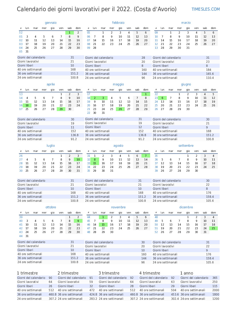 Per il 1 trimestre del 2022, ci sono 2 giorni di ferie e di riposo in Costa d'Avorio. Il 1 trimestre 2022 inizia il di sabato e termina il di giovedì.