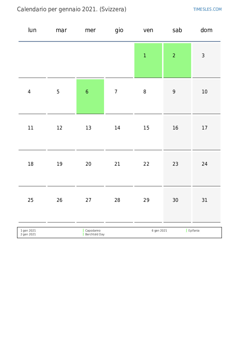 Calendario delle festività e dei fine settimana per gennaio 2021 per la Svizzera