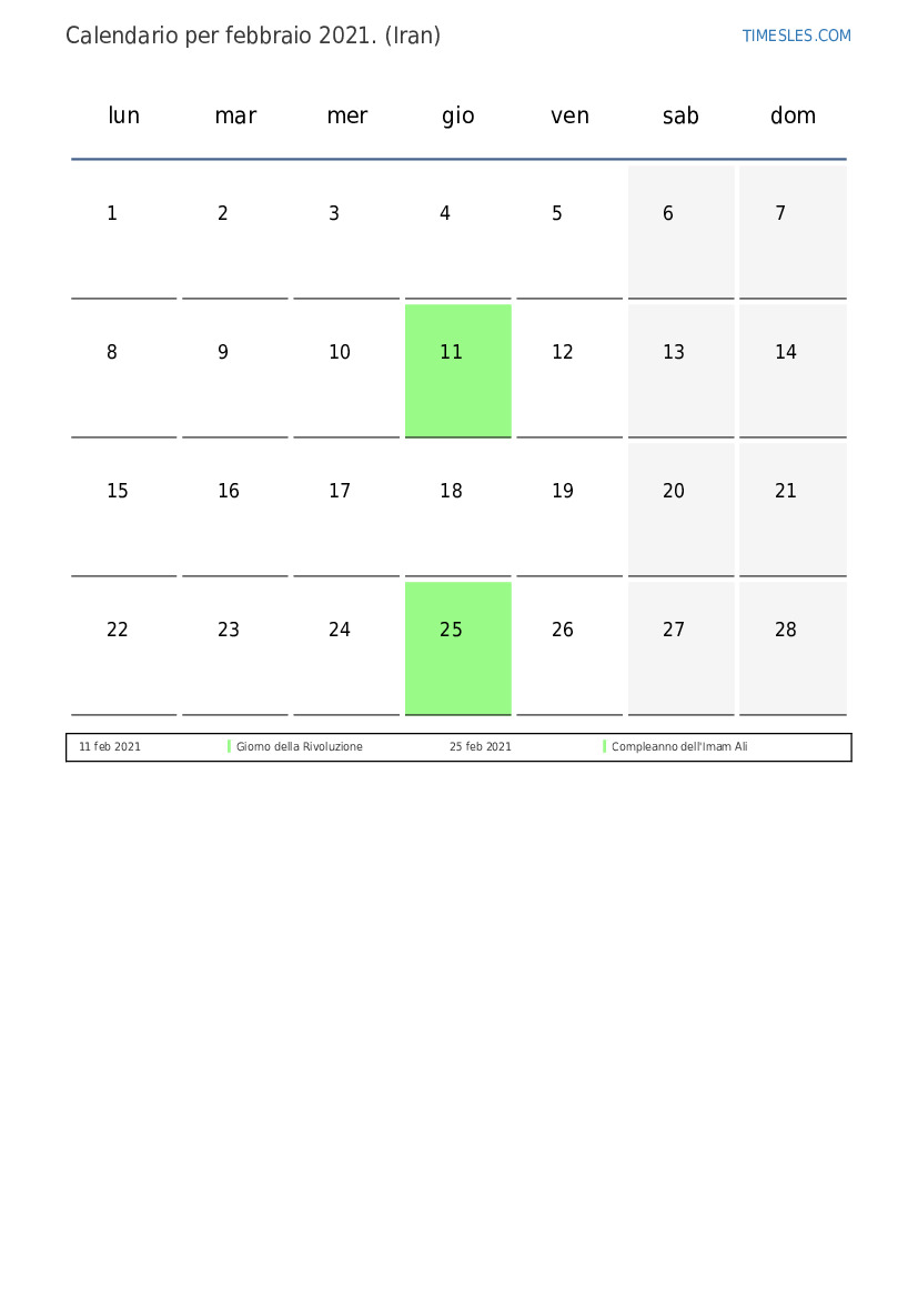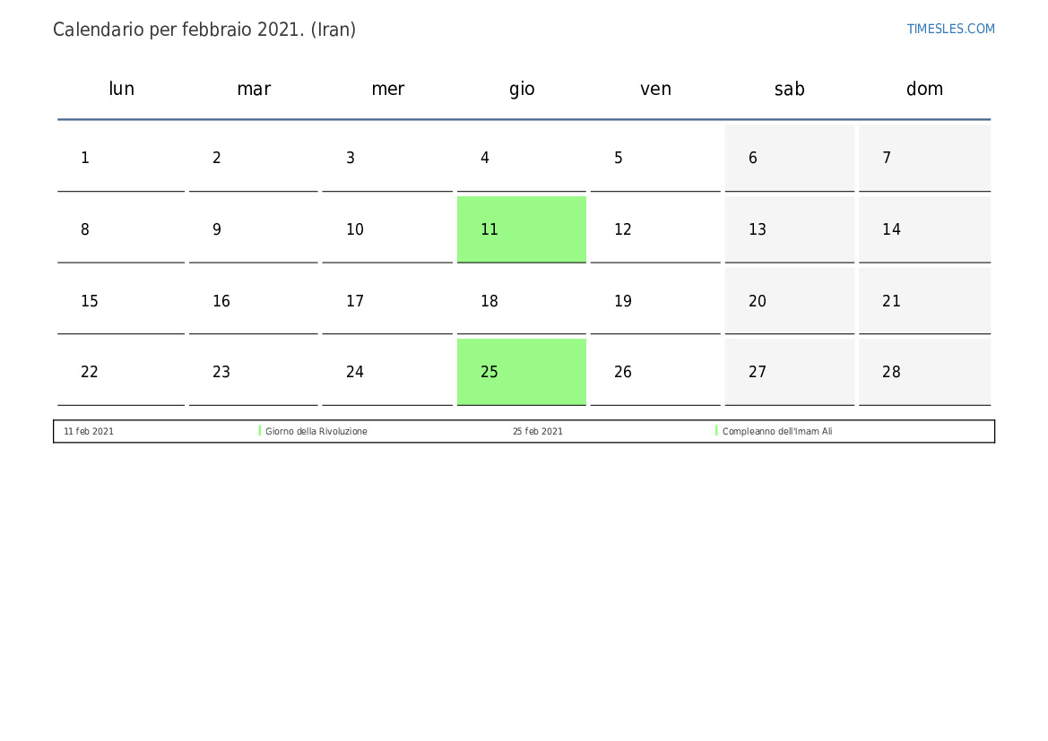 Scarica e stampa il calendario in PDF con i giorni festivi e i fine settimana di febbraio 2021 per l'Iran