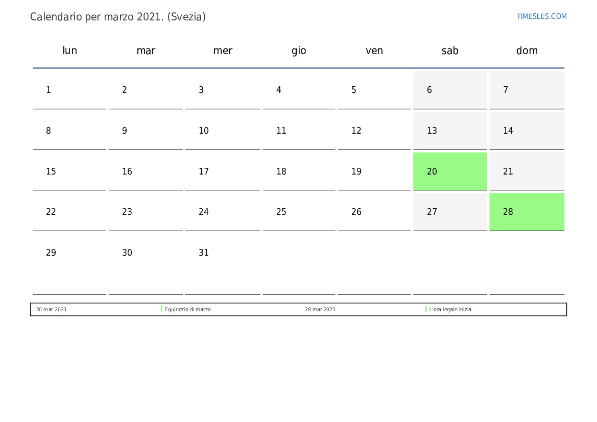 Scarica e stampa il calendario in PDF con i giorni festivi e i fine settimana di marzo 2021 per la Svezia