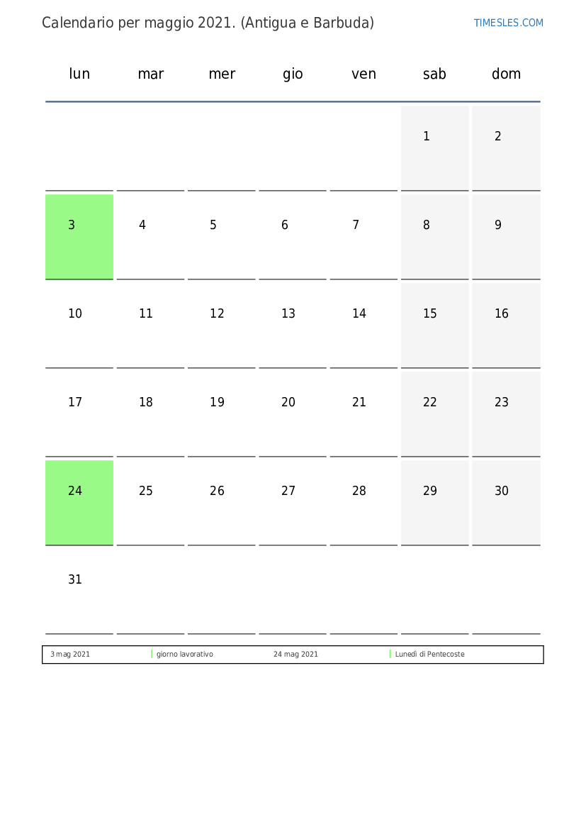 Calendario delle festività e dei fine settimana per maggio 2021 per Antigua e Barbuda