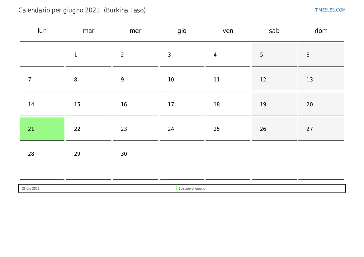 Il mese di giugno contiene 30 giorni. Questo è 6 mese del 2021. Stagione dell'anno: estate. Il mese di giugno inizia martedì e finisce di mercoledì. Nel mese di giugno 2021, ci sono 1 vacanze e giorno di riposo in Burkina Faso.