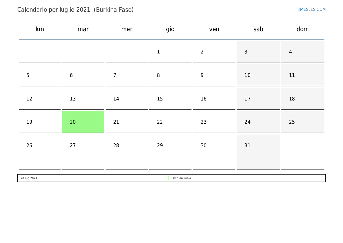 Calendario luglio 2021 per il Burkina Faso