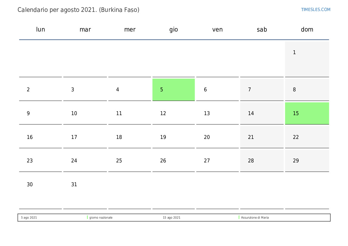 Calendario delle festività e dei fine settimana per agosto 2021 per il Burkina Faso
