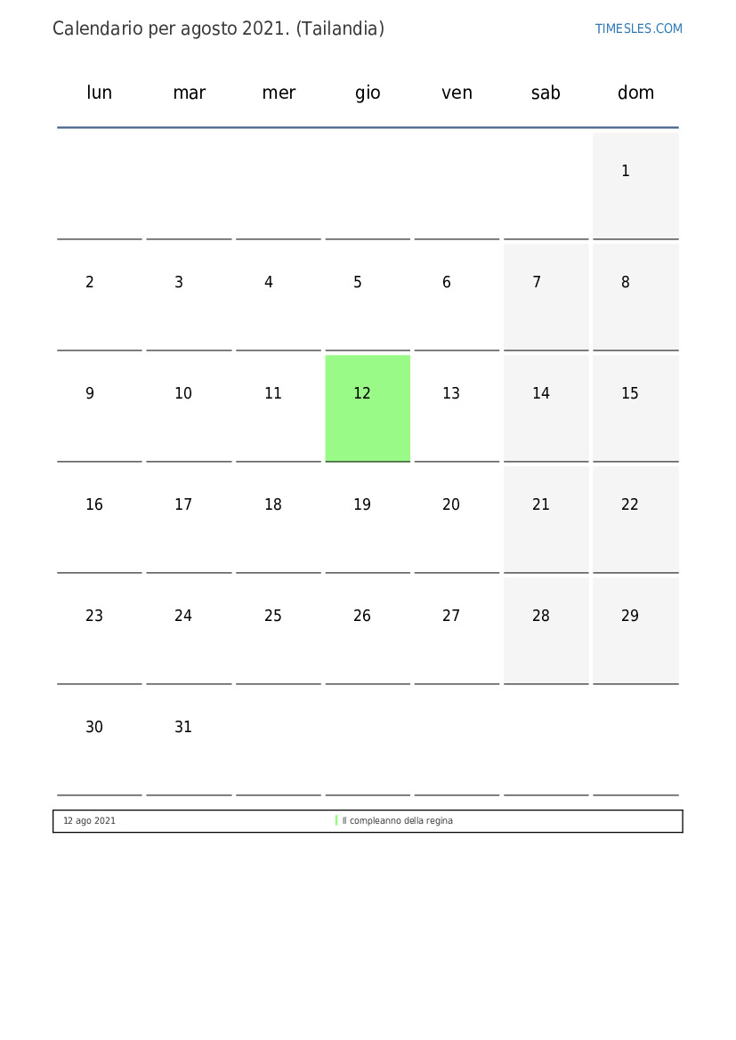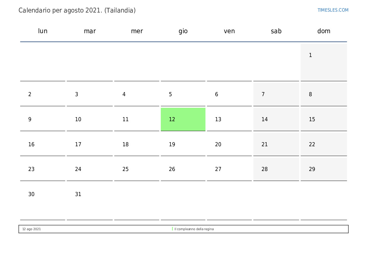 Scarica e stampa il calendario in PDF con i giorni festivi e i fine settimana di agosto 2021 per la Thailandia