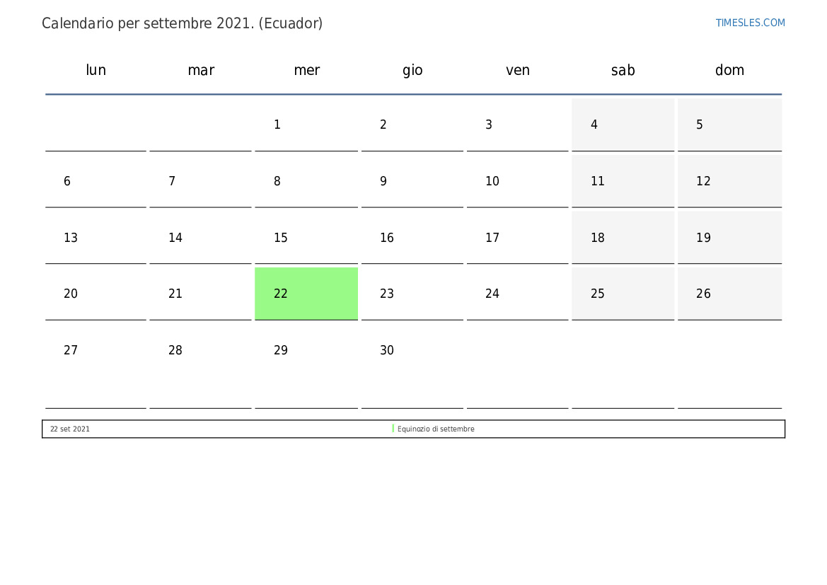 Il mese di settembre contiene 30 giorni. Questo è 9 mese del 2021. Stagione dell'anno: autunno. Il mese di settembre inizia di mercoledì e finisce di giovedì. Nel mese di settembre 2021, ci sono 1 vacanze e giorno di riposo in Ecuador.