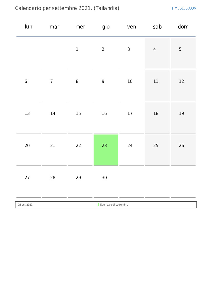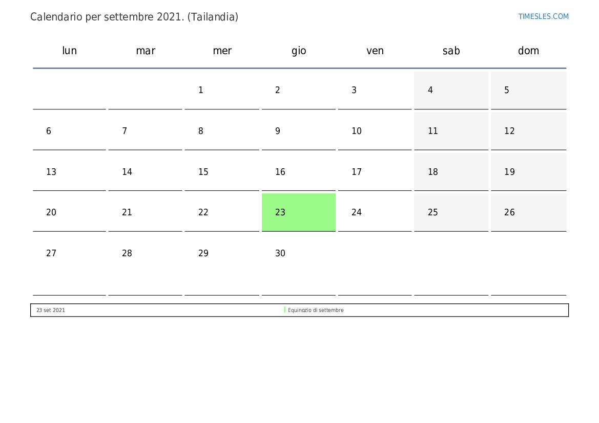 Il mese di settembre contiene 30 giorni. Questo è 9 mese del 2021. Stagione dell'anno: autunno. Il mese di settembre inizia di mercoledì e finisce di giovedì. Nel mese di settembre 2021, ci sono 1 vacanze e giorno di riposo in Thailandia.