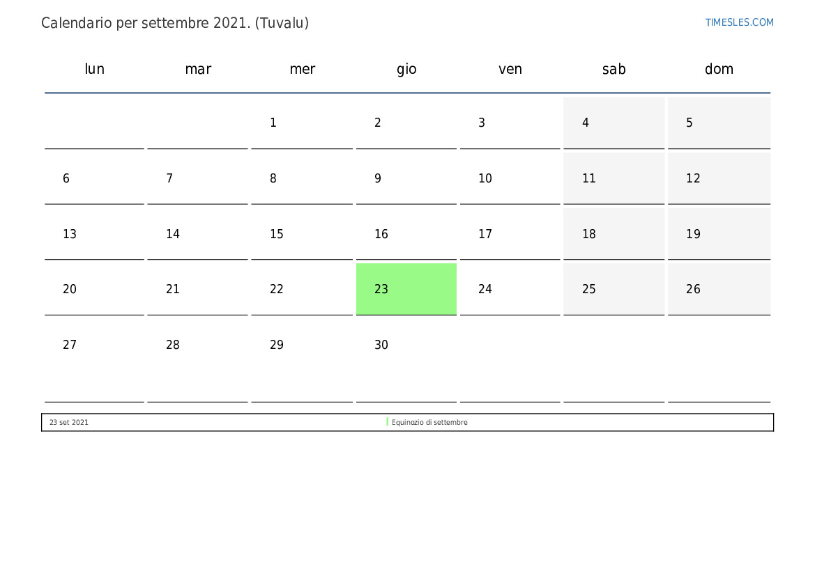 Calendario delle festività e dei fine settimana per settembre 2021 per Tuvalu