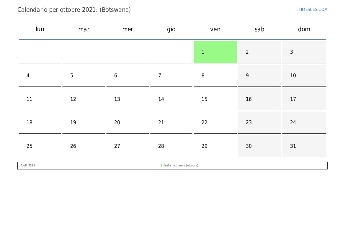 Scarica e stampa il calendario in PDF con i giorni festivi e i fine settimana di ottobre 2021 per il Botswana