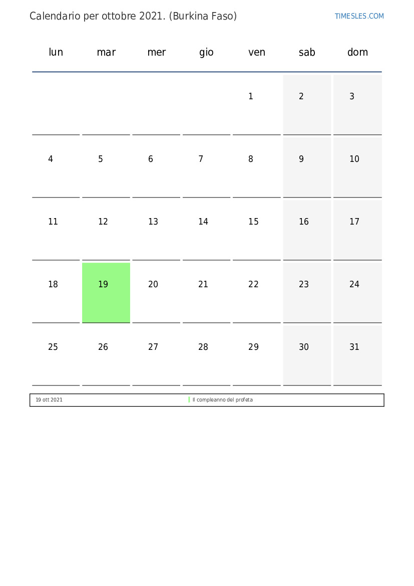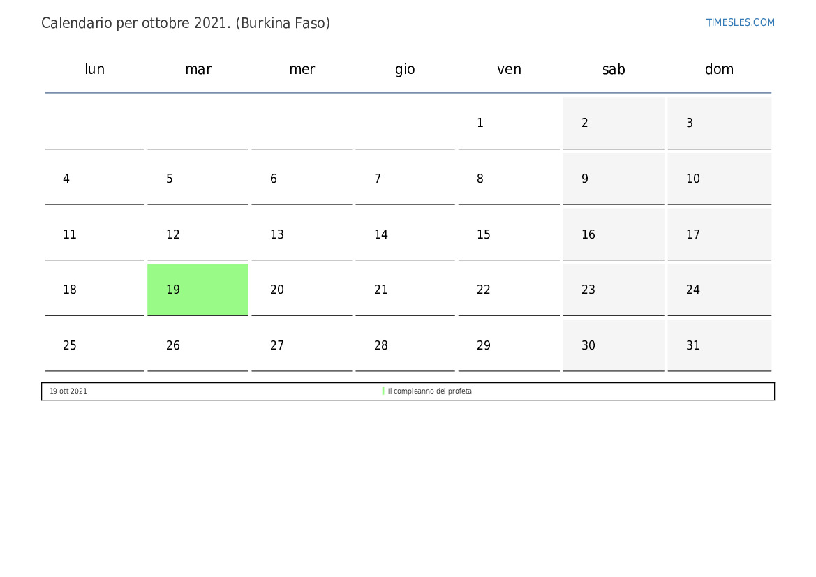 Calendario delle festività e dei fine settimana per ottobre 2021 per il Burkina Faso