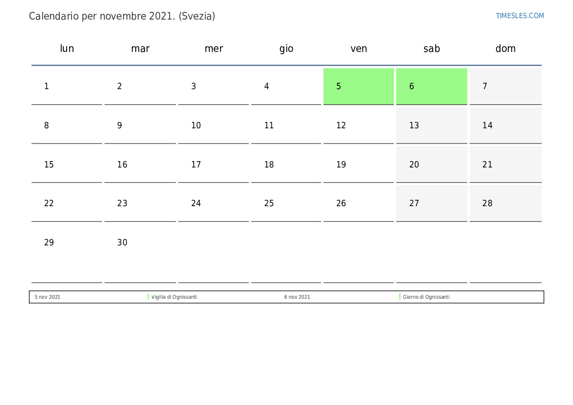 Calendario delle festività e dei fine settimana per novembre 2021 per la Svezia
