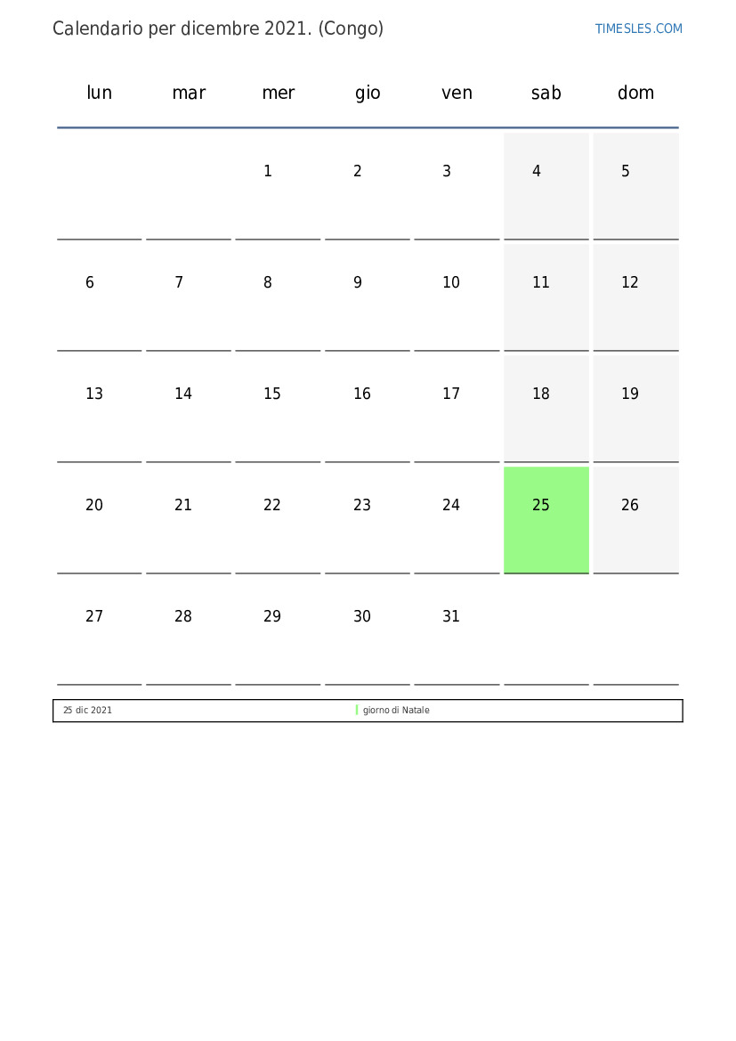 Scarica e stampa il calendario in PDF con i giorni festivi e i fine settimana di dicembre 2021 per il Congo