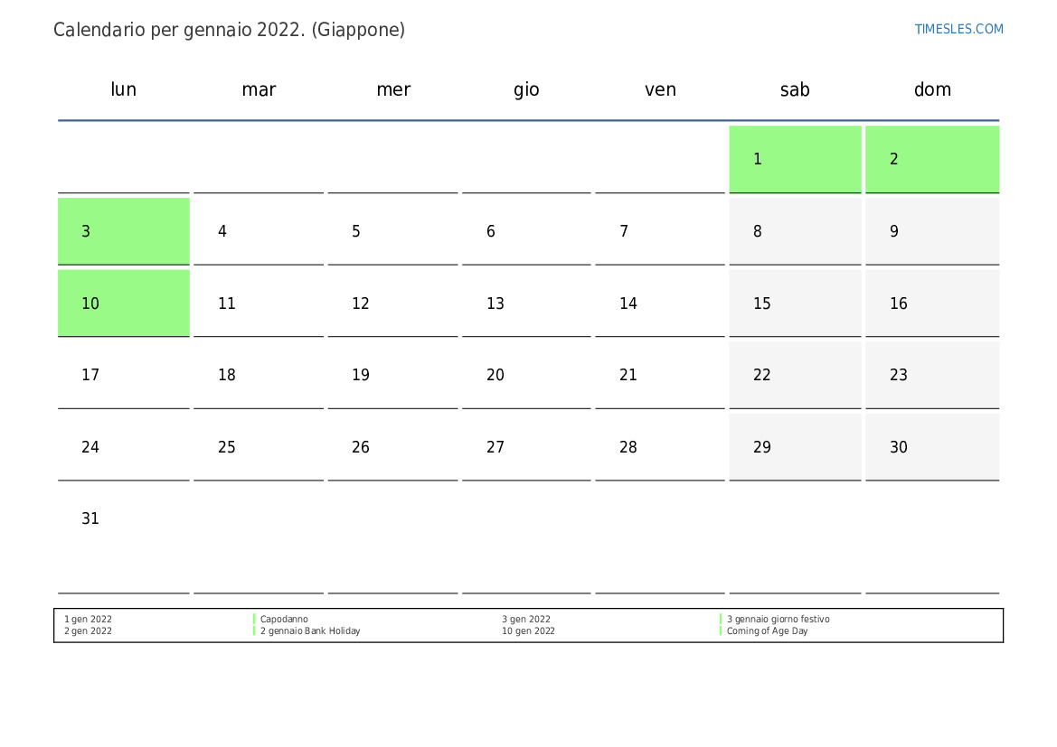 Scarica e stampa il calendario in PDF con i giorni festivi e i fine settimana di gennaio 2022 per il Giappone