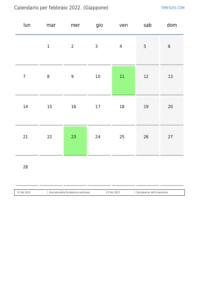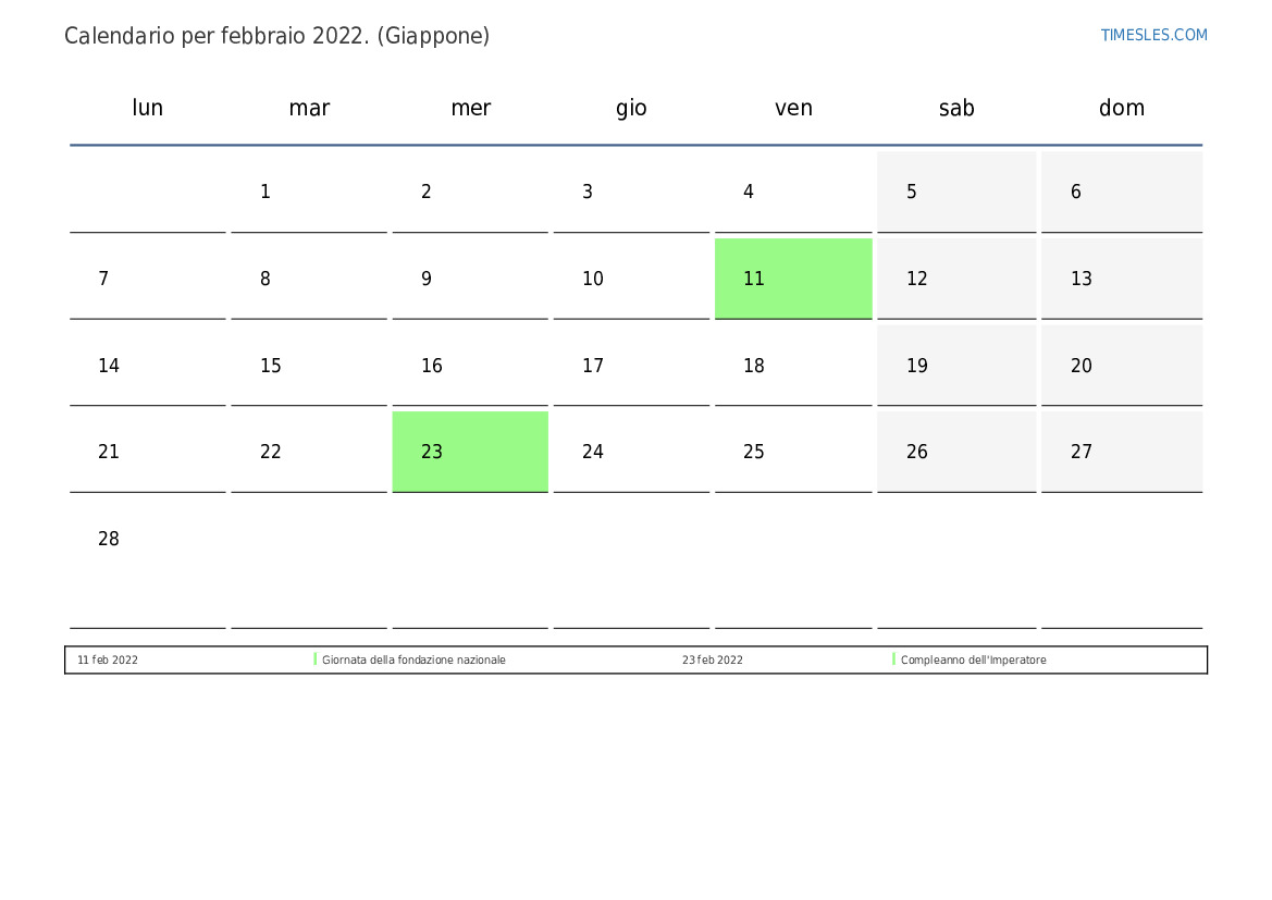 Il mese di febbraio contiene 28 giorni. Questo è 2 mese del 2022. Stagione dell'anno: inverno. Il mese di febbraio inizia martedì e finisce di lunedi. Nel mese di febbraio 2022, ci sono 3 giorni di ferie e di riposo in Giappone.