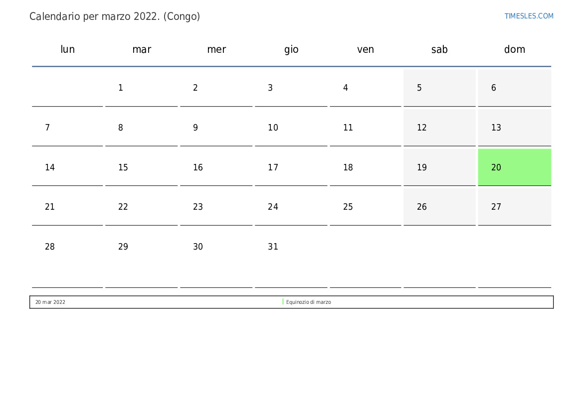 Il mese di marzo contiene 31 giorni. Questo è 3 mese del 2022. Stagione dell'anno: primavera. Il mese di marzo inizia martedì e finisce di giovedì. Nel mese di marzo 2022, ci sono 1 vacanze e giorno di riposo in Congo.