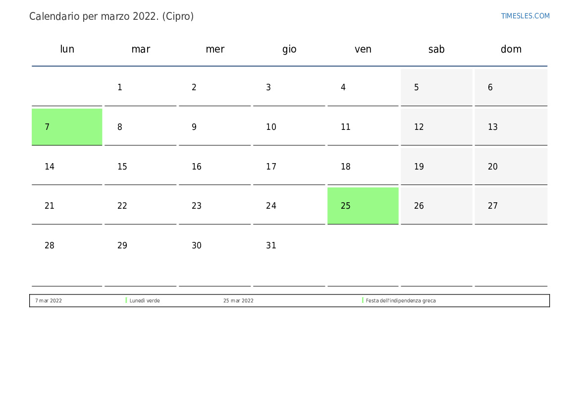 Il mese di marzo contiene 31 giorni. Questo è 3 mese del 2022. Stagione dell'anno: primavera. Il mese di marzo inizia martedì e finisce di giovedì. Nel mese di marzo 2022, ci sono 4 giorni di ferie e di riposo a Cipro.