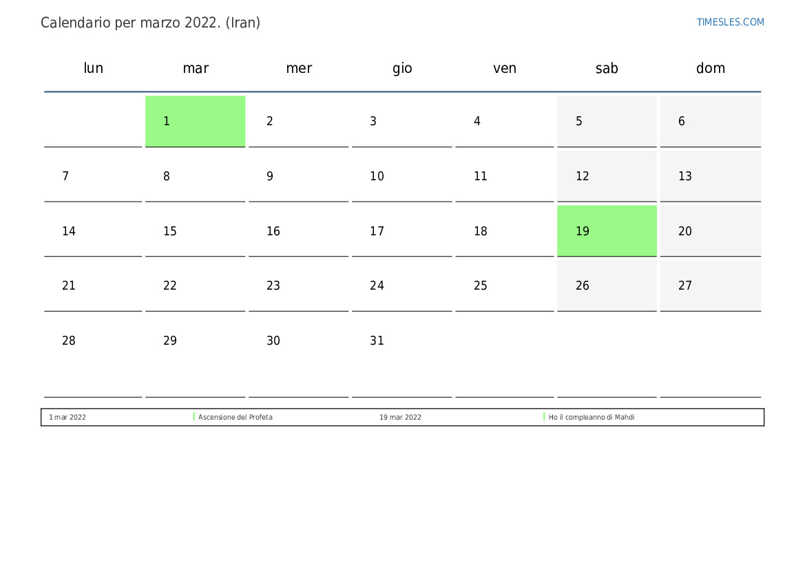 Il mese di marzo contiene 31 giorni. Questo è 3 mese del 2022. Stagione dell'anno: primavera. Il mese di marzo inizia martedì e finisce di giovedì. Nel mese di marzo 2022, ci sono 3 giorni di ferie e di riposo in Iran.