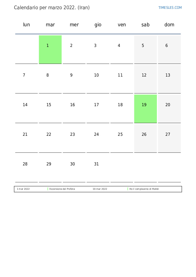 Scarica e stampa il calendario in PDF con i giorni festivi e i fine settimana di marzo 2022 per l'Iran