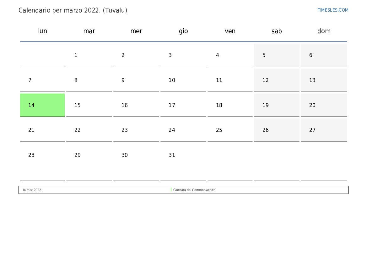 Calendario delle festività e dei fine settimana per marzo 2022 per Tuvalu