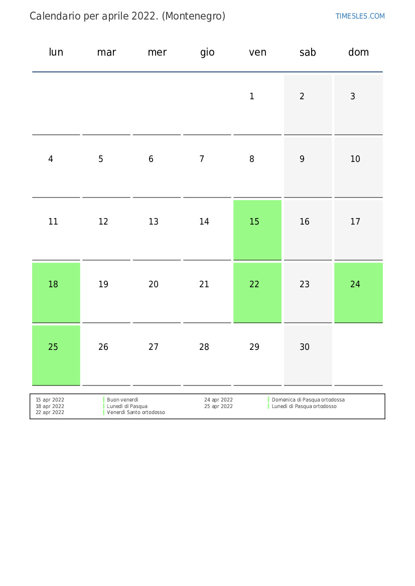 Il mese di aprile contiene 30 giorni. Questo è 4 mese del 2022. Stagione dell'anno: primavera. Il mese di aprile inizia di venerdì e finisce di sabato. Nel mese di aprile 2022, ci sono 5 giorni di ferie e di riposo in Montenegro.