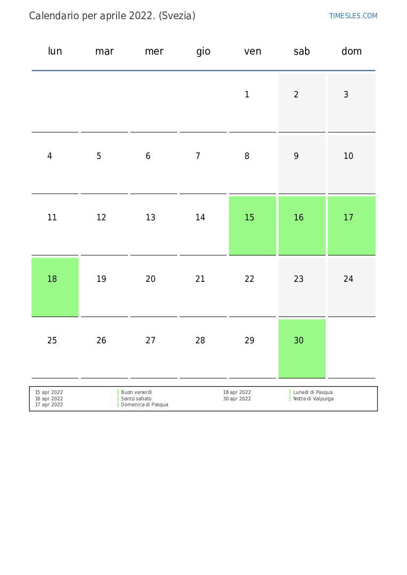 Il mese di aprile contiene 30 giorni. Questo è 4 mese del 2022. Stagione dell'anno: primavera. Il mese di aprile inizia di venerdì e finisce di sabato. Nel mese di aprile 2022, ci sono 5 giorni di ferie e di riposo in Svezia.