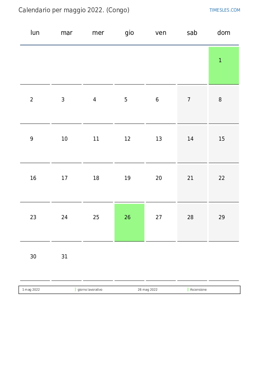 Scarica e stampa il calendario in PDF con i giorni festivi e i fine settimana di maggio 2022 per il Congo