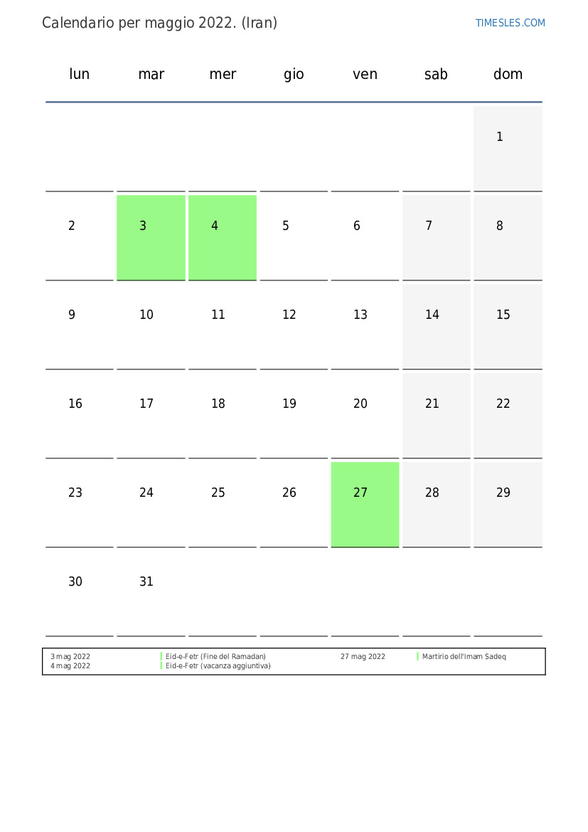 Scarica e stampa il calendario in PDF con i giorni festivi e i fine settimana di maggio 2022 per l'Iran
