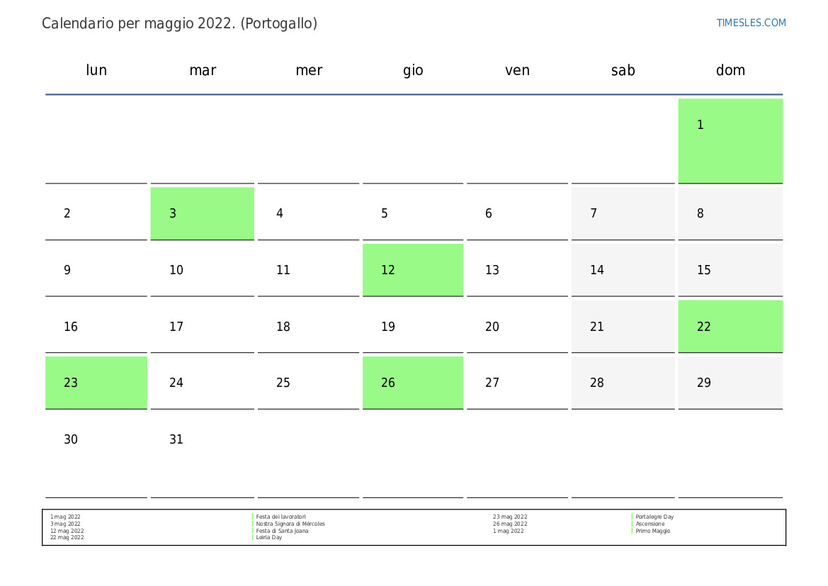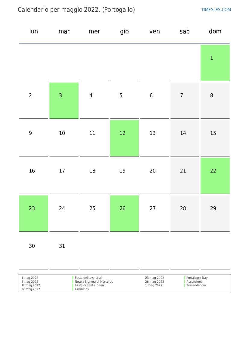 Il mese di maggio contiene 31 giorni. Questo è 5 mese del 2022. Stagione dell'anno: primavera. Il mese di maggio inizia la domenica e finisce martedì. Nel mese di maggio 2022, ci sono 8 giorni di ferie e di riposo in Portogallo.