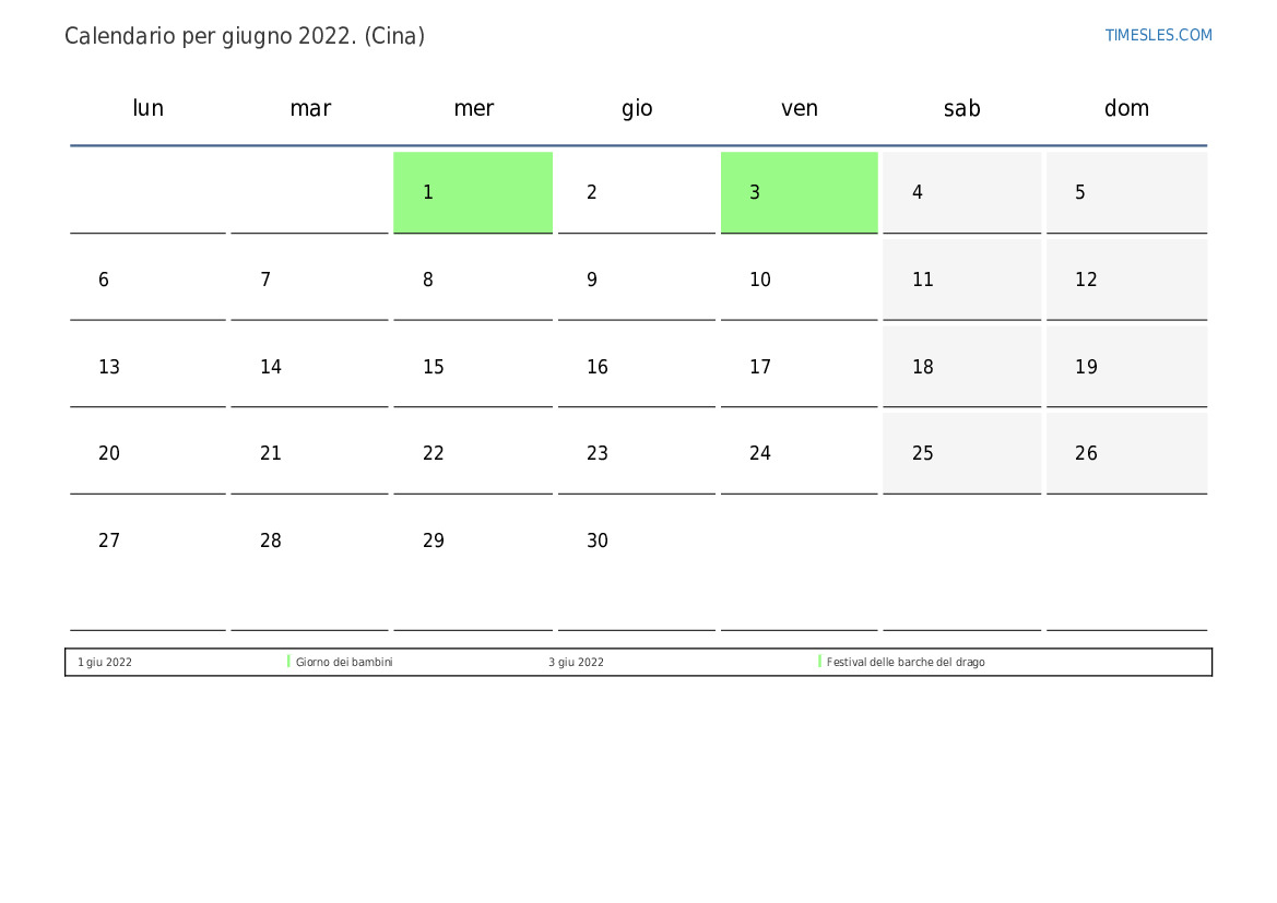 Scarica e stampa il calendario in PDF con i giorni festivi e i fine settimana di giugno 2022 per la Cina