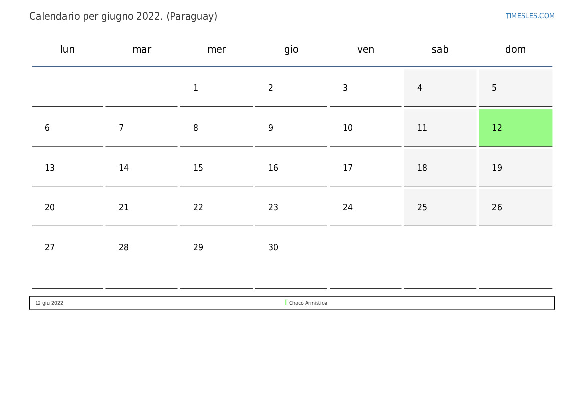 Calendario delle festività e dei fine settimana per giugno 2022 per il Paraguay