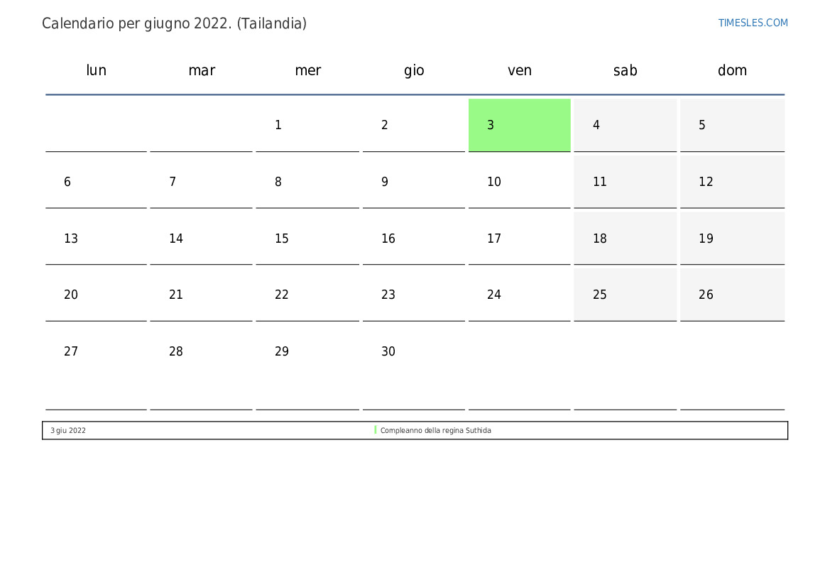 Scarica e stampa il calendario in PDF con i giorni festivi e i fine settimana di giugno 2022 per la Thailandia