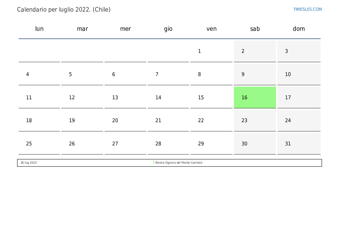 Scarica e stampa il calendario in PDF con i giorni festivi e i fine settimana di luglio 2022 per il Cile