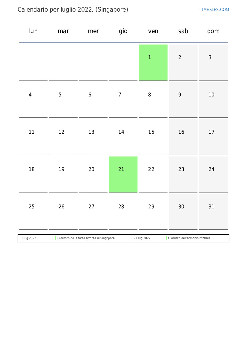 Scarica e stampa il calendario in PDF con i giorni festivi e i fine settimana di luglio 2022 per Singapore