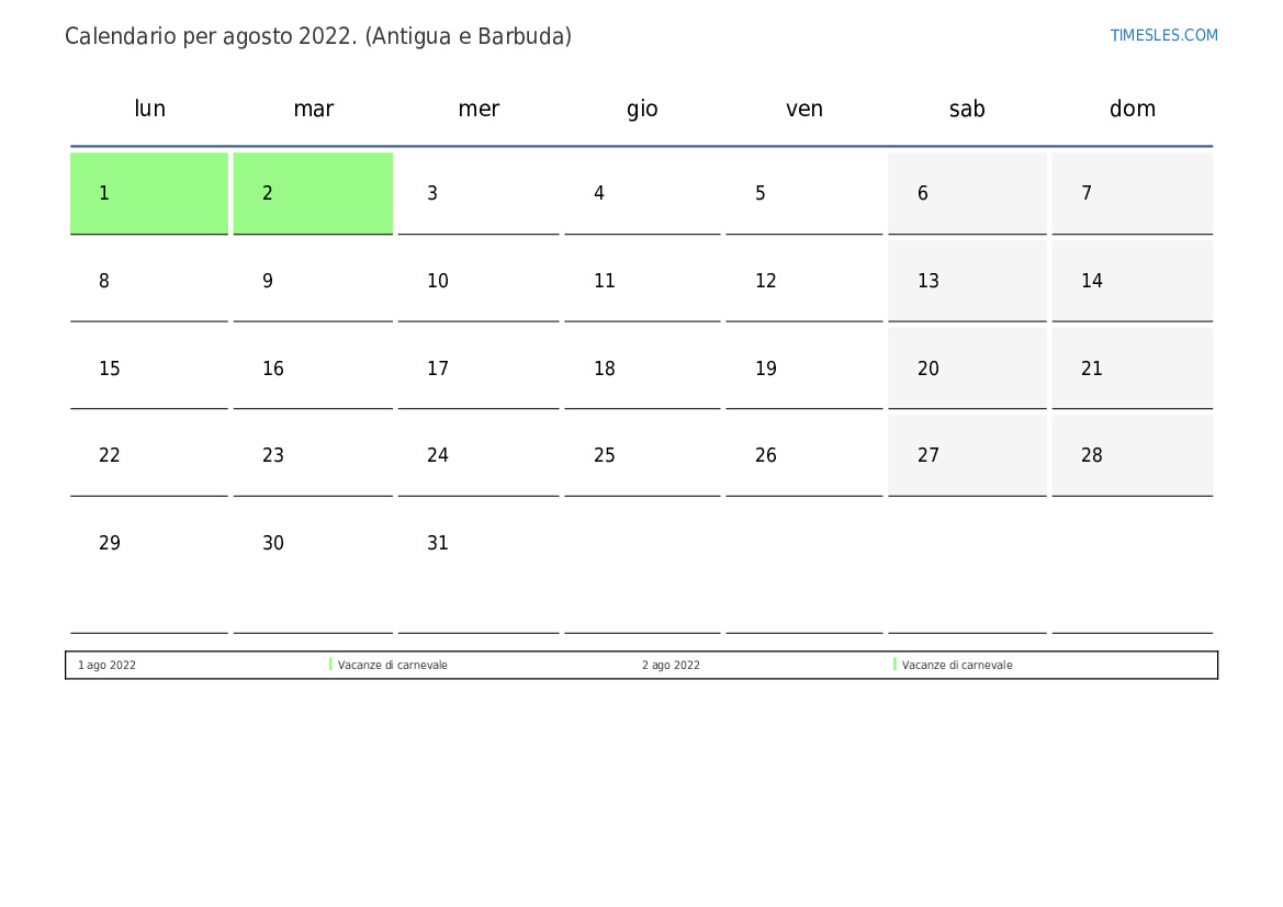 Scarica e stampa il calendario in PDF con i giorni festivi e i fine settimana di agosto 2022 per Antigua e Barbuda