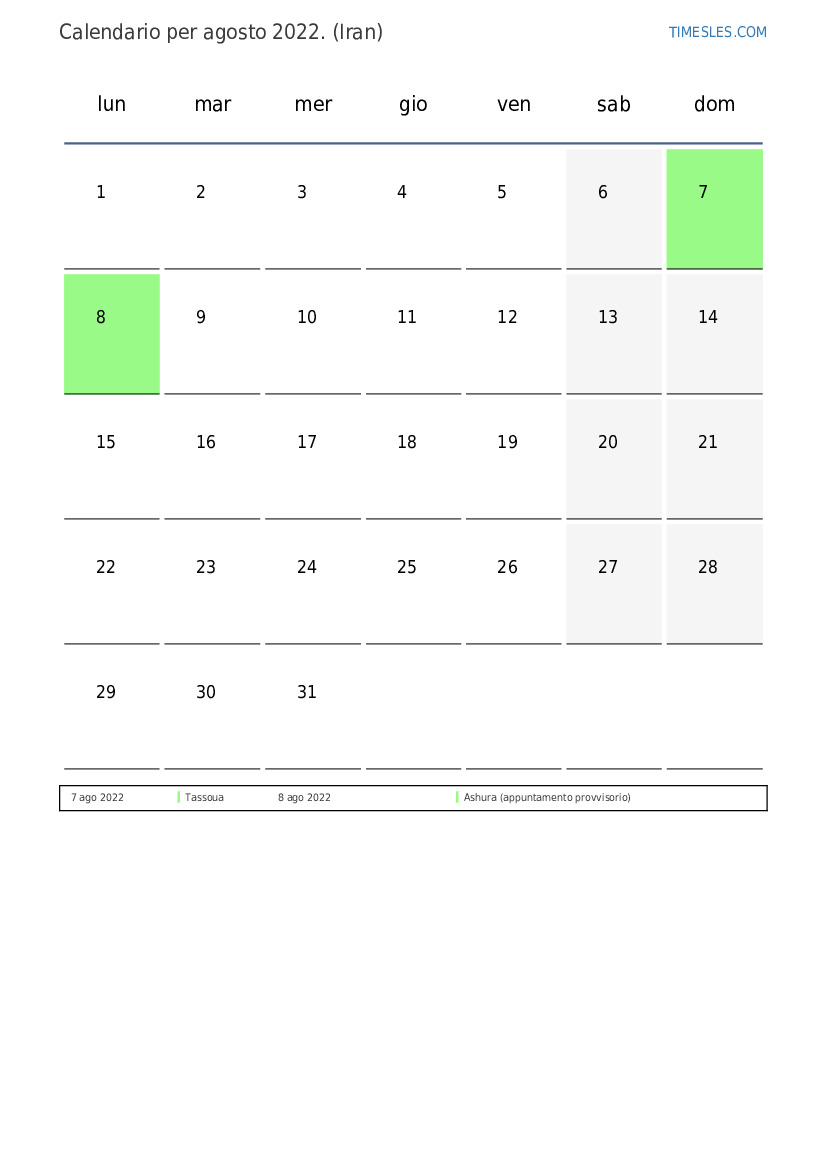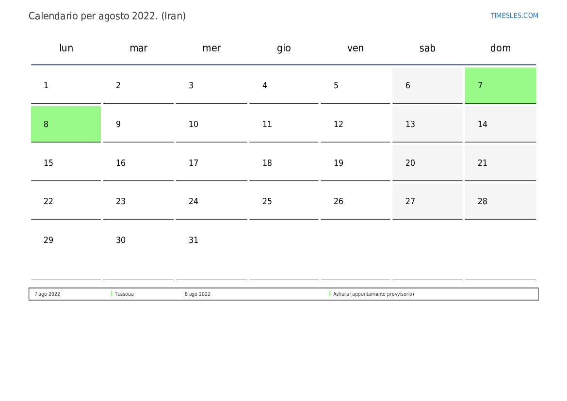 Scarica e stampa il calendario in PDF con i giorni festivi e i fine settimana di agosto 2022 per l'Iran