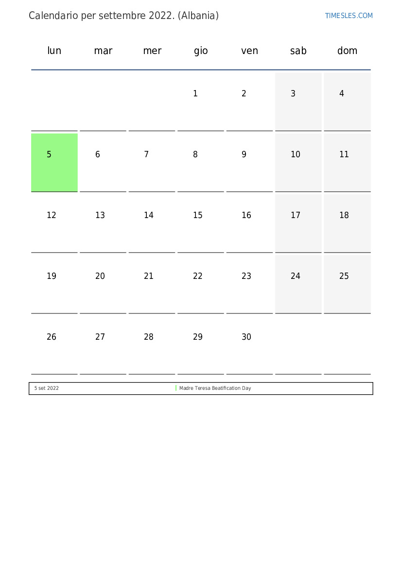 Scarica e stampa il calendario in PDF con i giorni festivi e i fine settimana di settembre 2022 per l'Albania