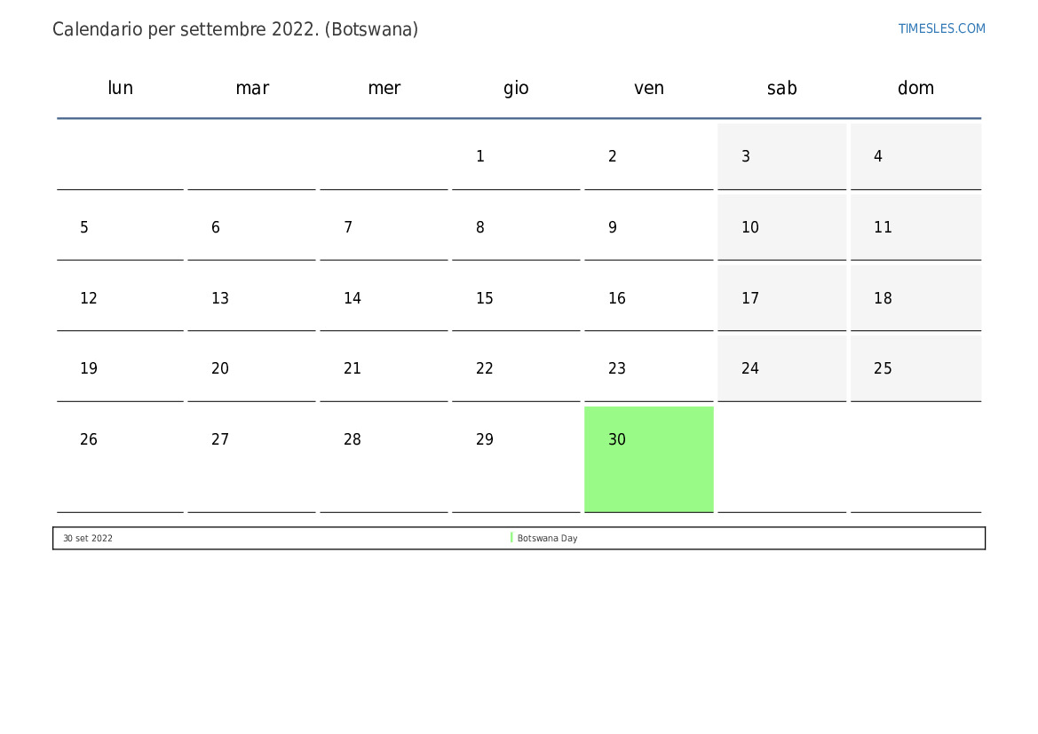 Scarica e stampa il calendario in PDF con i giorni festivi e i fine settimana di settembre 2022 per il Botswana
