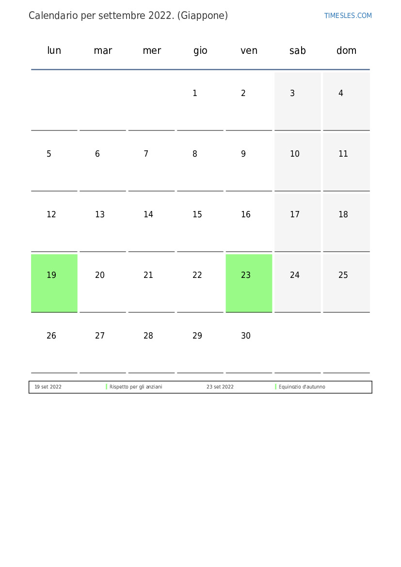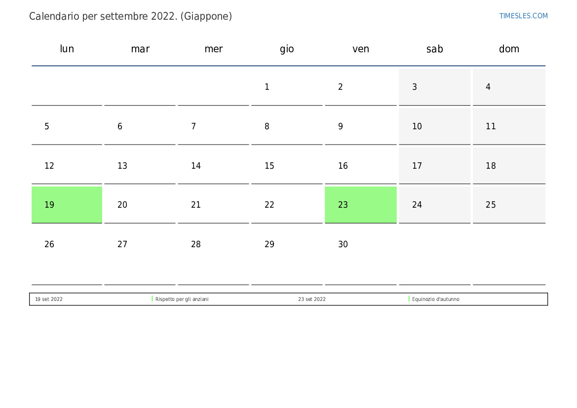 Scarica e stampa il calendario in PDF con i giorni festivi e i fine settimana di settembre 2022 per il Giappone