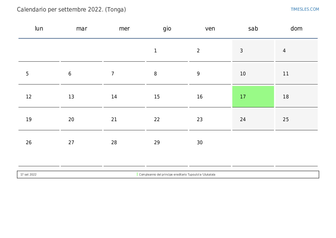 Calendario delle festività e dei fine settimana per settembre 2022 per Tonga