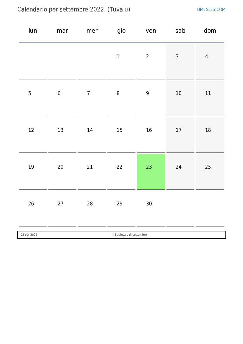 Scarica e stampa il calendario in PDF con i giorni festivi e i fine settimana di settembre 2022 per Tuvalu
