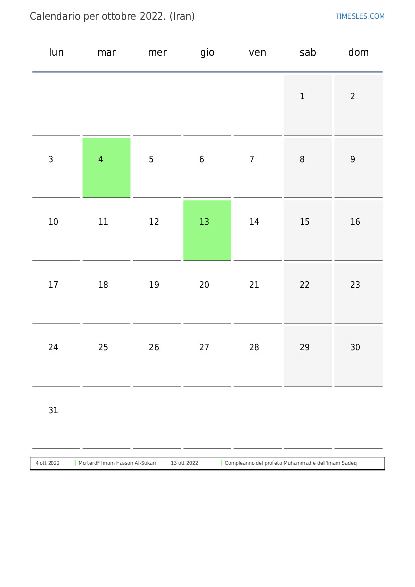 Scarica e stampa il calendario in PDF con i giorni festivi e i fine settimana di ottobre 2022 per l'Iran