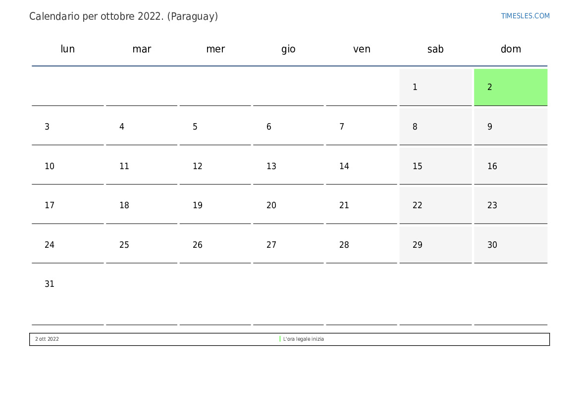 Scarica e stampa il calendario in PDF con i giorni festivi e i fine settimana di ottobre 2022 per il Paraguay
