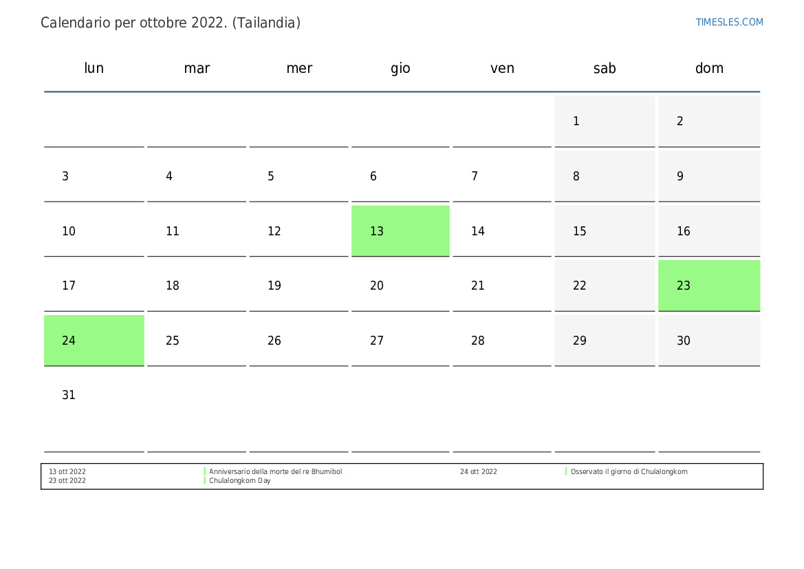 Calendario delle festività e dei fine settimana per ottobre 2022 per la Thailandia
