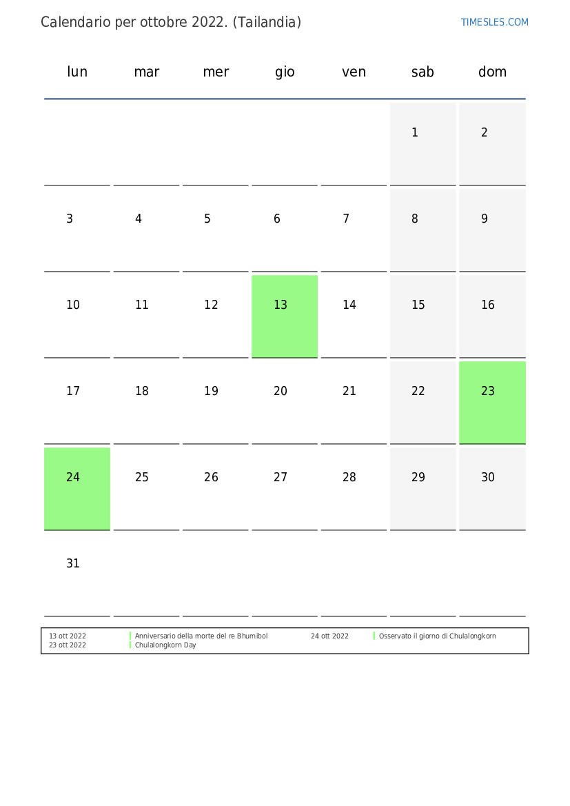 Il mese di ottobre contiene 31 giorni. Questo è 10 mese del 2022. Stagione dell'anno: autunno. Il mese di ottobre inizia di sabato e finisce di lunedi. Nel mese di ottobre 2022, ci sono 4 giorni di ferie e di riposo in Thailandia.