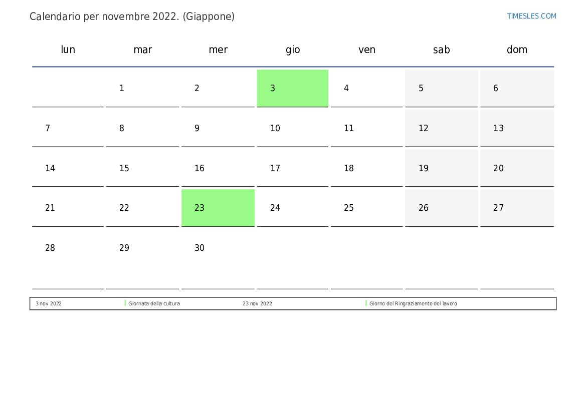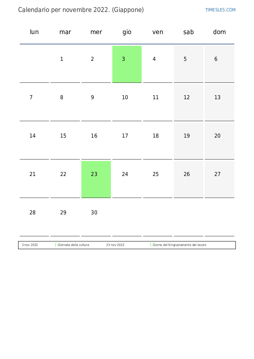 Scarica e stampa il calendario in PDF con i giorni festivi e i fine settimana di novembre 2022 per il Giappone