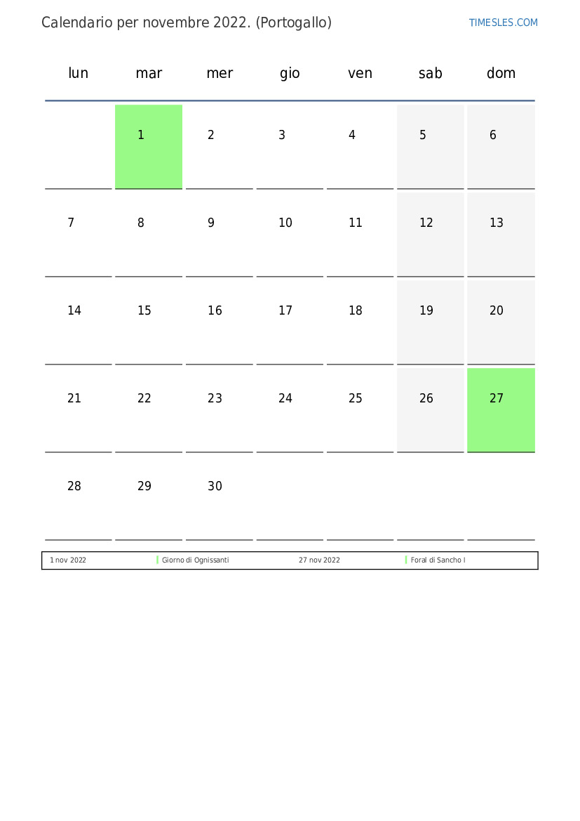 Calendario novembre 2022 per il Portogallo