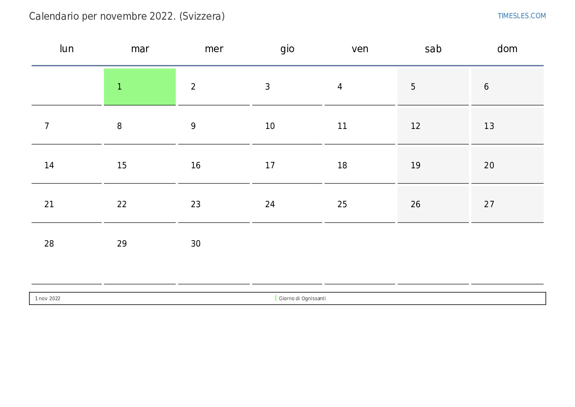 Scarica e stampa il calendario in PDF con i giorni festivi e i fine settimana di novembre 2022 per la Svizzera